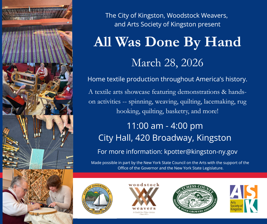 March 28, 2026 the guild will sponsor a special event with the City of Kingston and Art Society of Kingston. Guild members, and others, will be demonstrating fiber techniques from history and today.